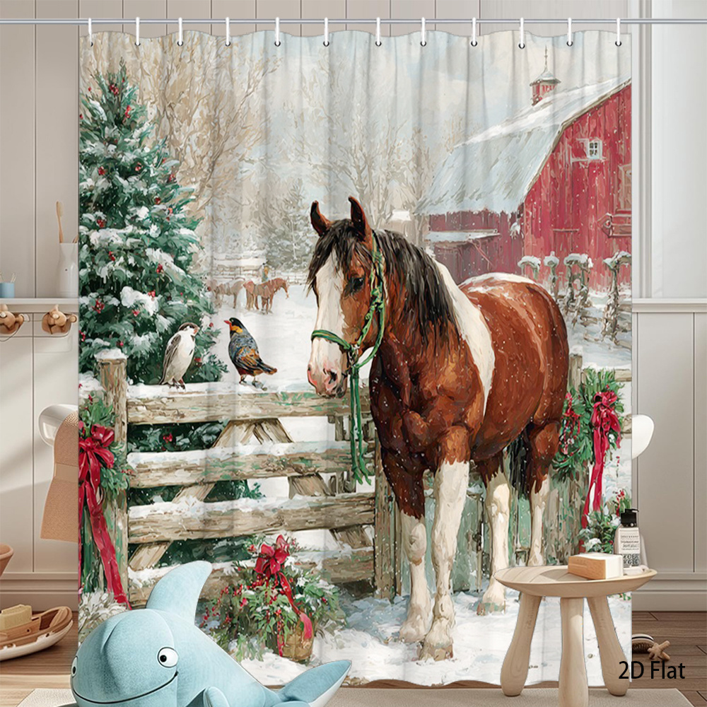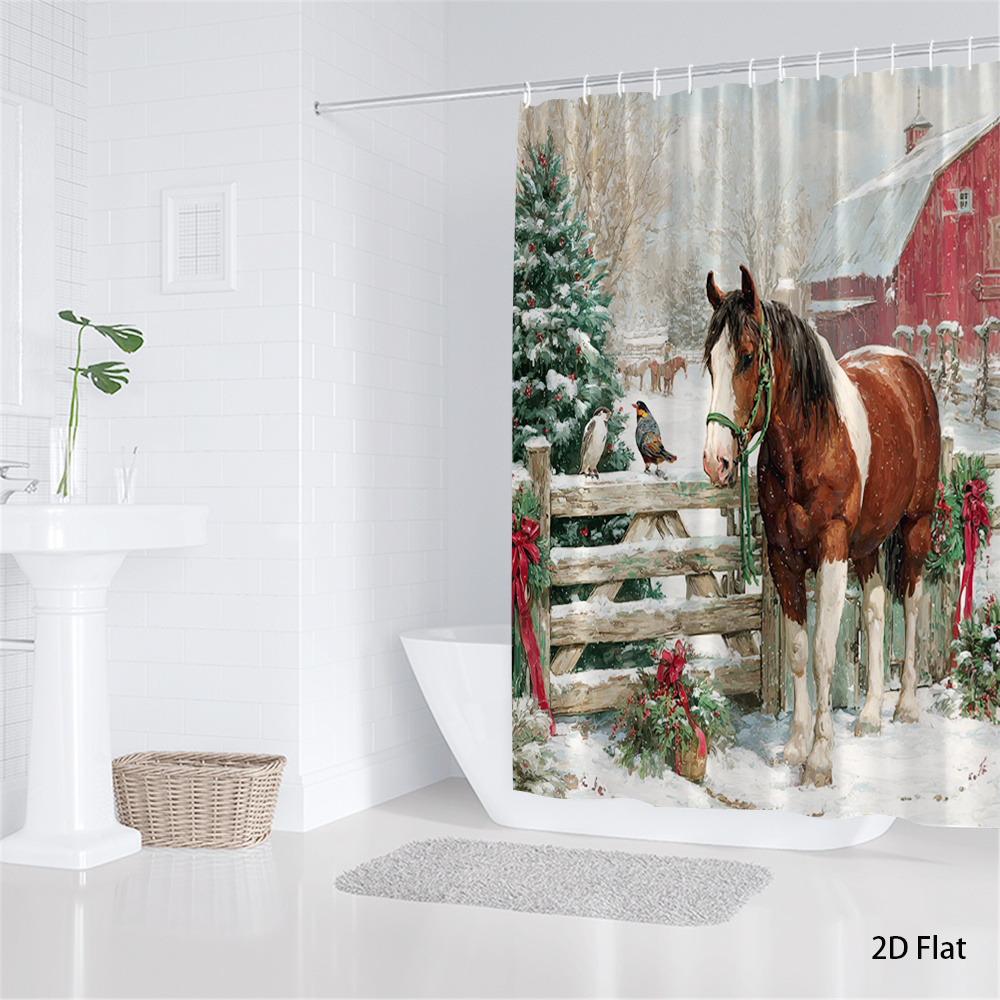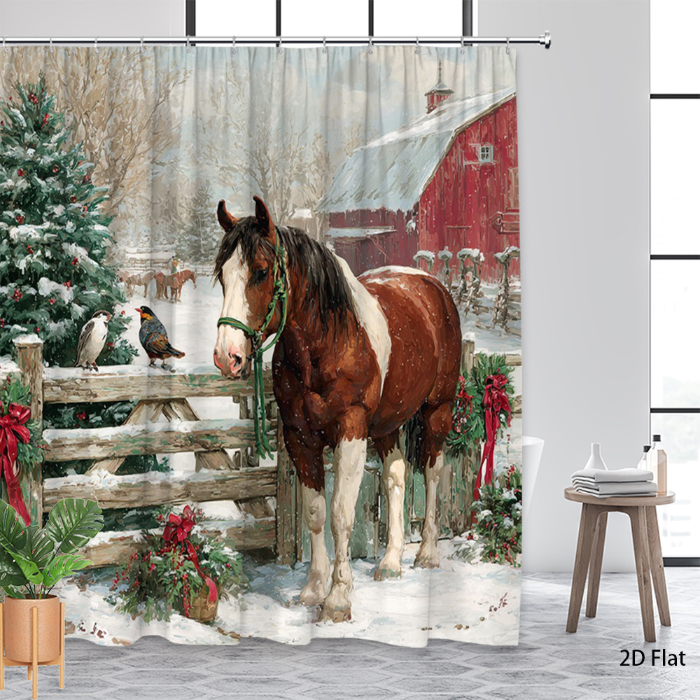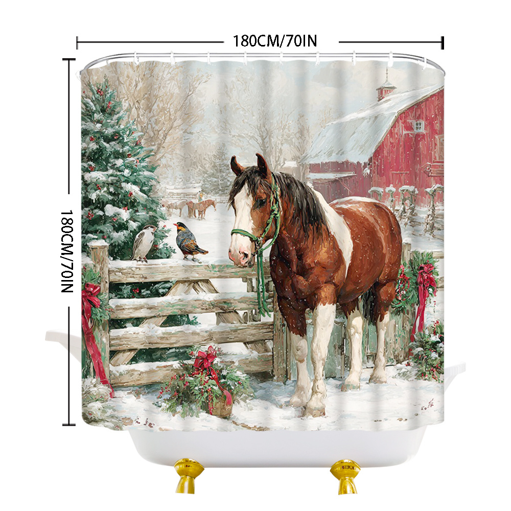 1pc Extra Long Christmas Horse and Barn Shower Curtain - Winter Farmhouse Bathroom Decor with Brown Horse, Red Barn & Snowy Landscape - Rustic Country Bathroom Window Treatment - Machine Washable Polyester Fabric Bath Curtain